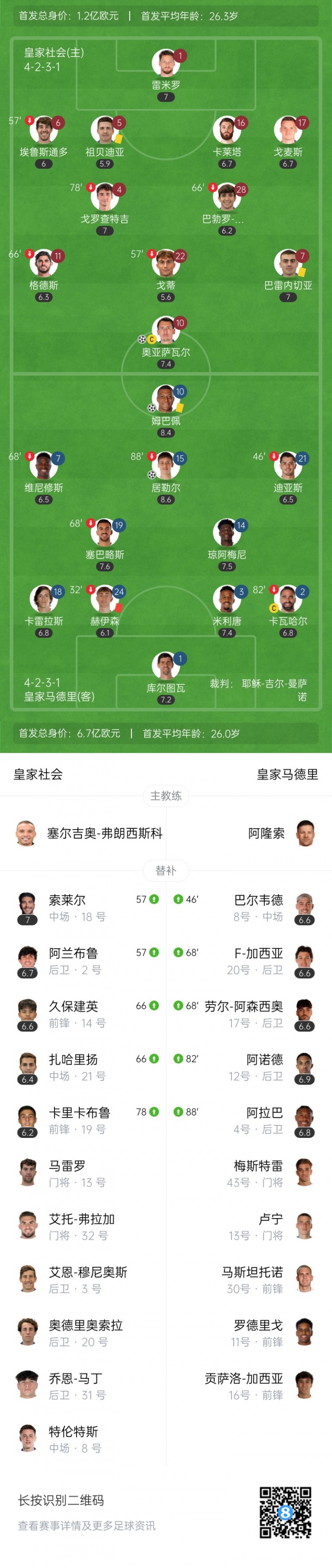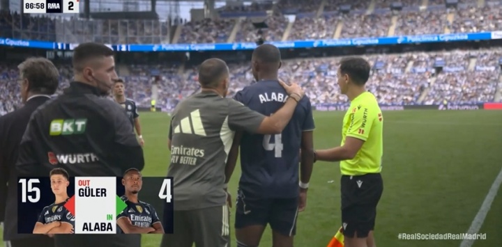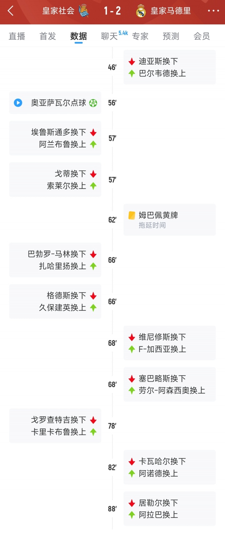 在比赛伤停补时阶段,皇马用阿拉巴换下居勒尔,阿诺德、阿森西奥、加西亚、阿拉巴、米利唐、卡雷拉斯6名后卫同期在场上进行选藏,本场比赛皇马名单中的8名后卫沿途登场了一遍。