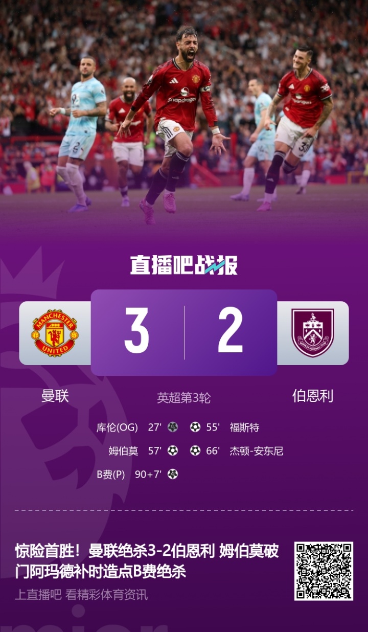 上一轮英超,伯恩利在补时第7分钟被B费点球绝杀,2-3负于曼联。